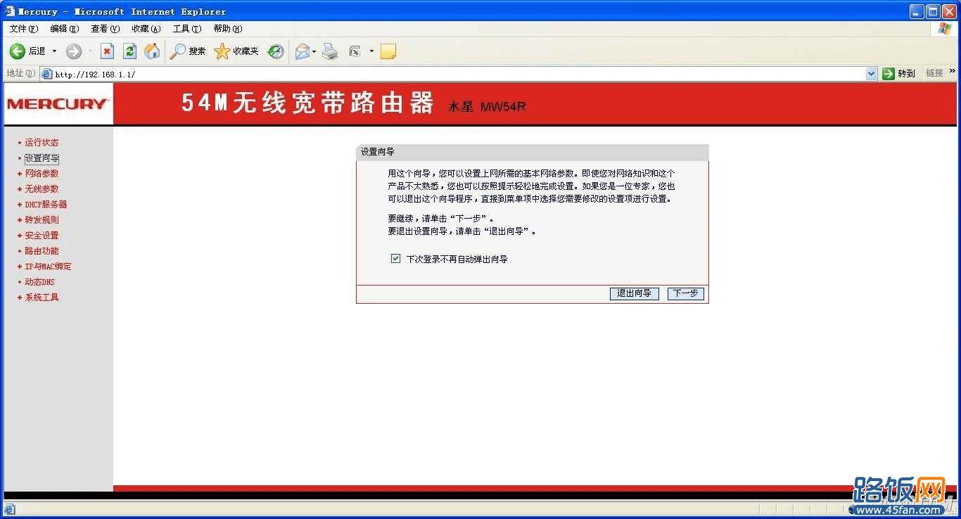2、进入路由器后,出现设置向导界面,点击"下一步“,出现"设置向导-上网方式"选项,此处可根据当前上网方式选择,如采用ADSL拨号上网,则选择第一项(ADSL虚拟拨号);如使用运态IP地址上网则选择第二项(自动从网络服务商获取IP地址);如运营商提供静态IP地址上网则使用第三项(网络服务商提供的固定IP地址)。