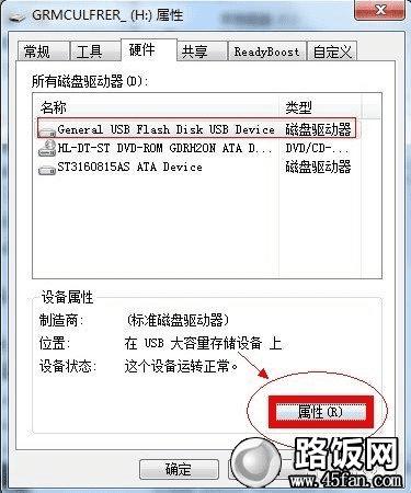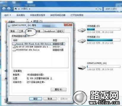 四:首先进入“我的电脑”找到可移动磁盘,在其盘符上右键选择属性,然后切换到“硬件”选项卡,如下图: