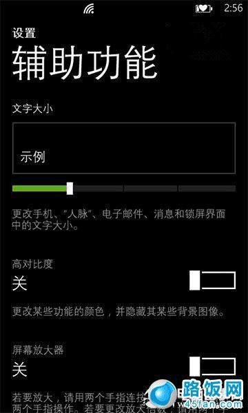 视力不好的人别总迷着眼看,何苦委屈自己。进入设置\系统\辅助功能,尝试打开“高对比度”,增加“文字大小”,或打开“屏幕放大镜”通过双击来放大,平移查看屏幕上的内容。