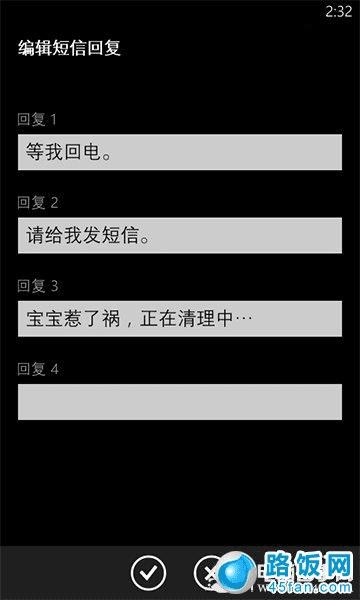 在不方便接听电话时,让手机自动发短信通知来电者。设置\应用程序\电话\编辑回复,可以定制4条回复。当有电话打来时,在屏幕上滑动选择“短信回复”即可。