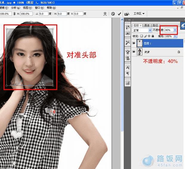 3、把图层一的不透明度设置为40%左右,并且把头部位置对准
