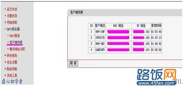 第十一步:选择客户端列表就可以显示出当前通过路由器连接的本地网络的主机的名称。客户端主机的MAC地址,和分配给他们的IP地址,和其剩余的IP地址的使用时间。