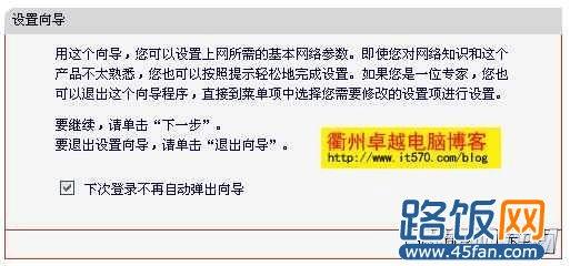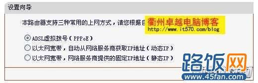 2、进入路由器后,出现设置向导界面,点击"下一步“,出现"设置向导-上网方式"选项,此处可根据当前上网方式选择,如采用ADSL拨号上网,则选择第一项(ADSL虚拟拨号);如使用运态IP地址上网则选择第二项(自动从网络服务商获取IP地址);如运营商提供静态IP地址上网则使用第三项(网络服务商提供的固定IP地址)。