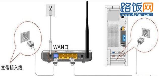 使用其中一根网线从外网宽带接入线连接至无线路由器的WAN口,另一根网线从无线路由器的任意LAN口(上图黄色)连接至电脑网卡上即可。