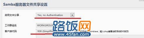 3、在Samba服务器文件共享设置中,开启文件共享选“Yes,no Authentication”,一般出现的客户端代码选择“936(simplified chinese)”即可。如下图所示: