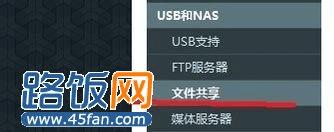 2、进入路由器管理界面后,在USB和NAS选项下,可以看到有四个小选项,分别是USB支持、FTP服务器、文件共享及媒体服务器。既然我们要讲文件共享,则单击“文件共享”选项。
