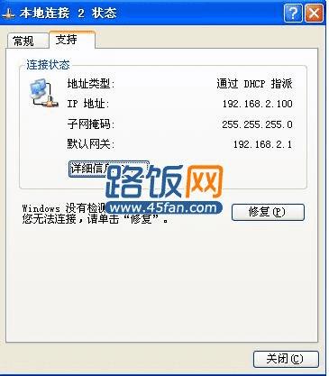 双击右下角网络图标,出现“本地连接状态“框,出现常规和支持两个选项,点击“支持”即可查询当前网关地址。如下图所示: