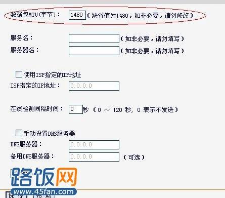 设置方法:打开IE浏览器,在地址栏中输入192.168.1.1,进入WEB界面后,点击“网络参数”->“WAN口设置”,将默认数据包MTU(字节)改小一些。比如改为1450或1400,如果还是不行,可以改为比1400更小的值。