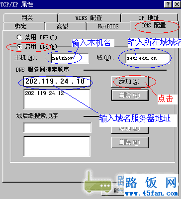 DNS:将“启用DNS”勾选,“主机名”与“域”随便填写,在DNS服务器搜索顺序里填写当地DNS地址(如不清楚,请咨询当地服务提供商),点击添加。