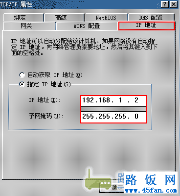 IP地址栏,选择手动,输入:192.168.1.x 掩码:255.255.255.0