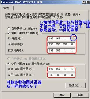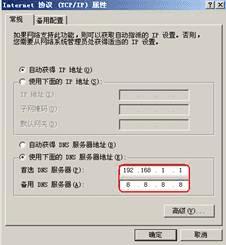 l 如果能够登录QQ不能打开网页,则可能获取DNS不正确,打开“本地连接状态—属性—Internet协议(TCP/IP)--属性”,手动填写DNS服务器地址192.168.1.1和8.8.8.8。或联系运营商咨询当地DNS地址,然后手动填入。