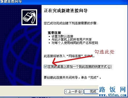 7、正在完成新建连接向导,选择“在我的桌面上添加一个到此连接的快捷方式”,目的是以后开机直接在桌面上能看到宽带拨号连接。如图所示: