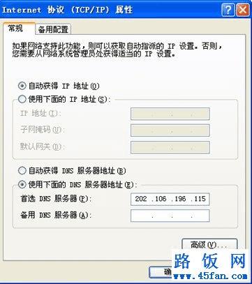 在下面的对话框中点选使用下面的DNS服务器地址。然后敲入DNS服务器地址,点击确定即可。