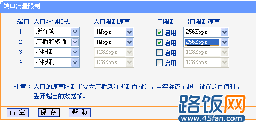 4、tl-r4149路由器共四个端口,可分别设置为不同网段。在“端口流量限制”界面下,可对某一端口限制速率,具体设置如下图所示: