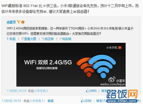 无独有偶,11 月 8 日,小米董事长雷军在微博上表示,小米2A/小米3/小米电视/新小米盒子已支持双频 Wi-Fi,但需要支持双频的路由器配合,还问网友们换了双频路由器了没有。对此,我们也不难猜测,小米对于路由器市场也是蠢蠢欲动了,毕竟前有小米盒子的推出,现在再顺势推出一款路由器,也并非是什么意想不到的事。