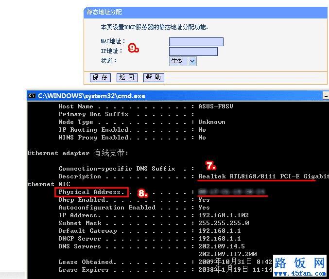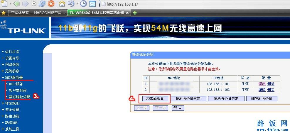 9.在静态地址分配表页面,输入对应的MAC地址和你想要设定的内部IP地址“192.168.1.XXX”最后一位可以自由选择,从2~255,保存,并选择该条目生效。