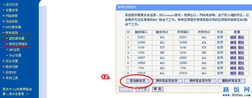 12.选择工具栏的“转发规则”——>“特殊应用程序”,并添加新条目(此步骤为打开端口)