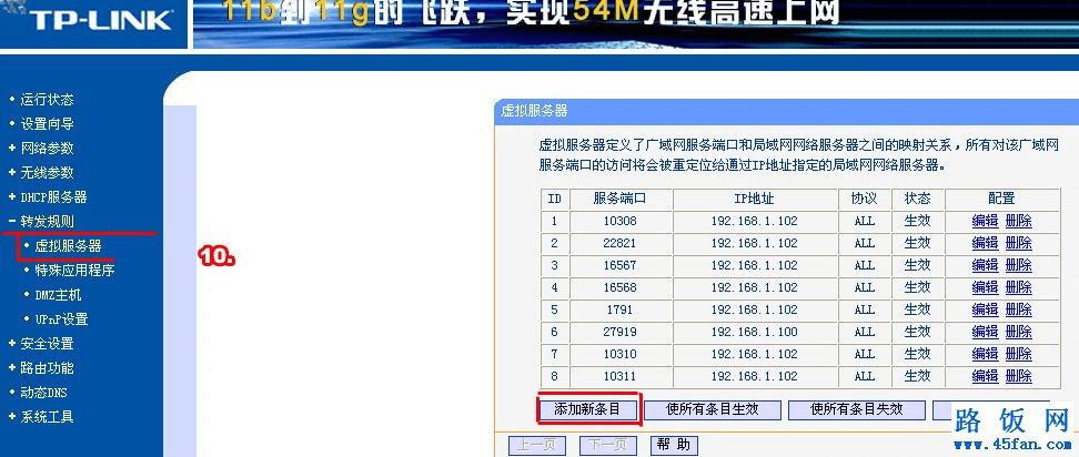 10.这一步才是本文中的重点,选择工具栏的“转发规则”——>“虚拟服务器”,并添加新条目(此步骤为进行端口映射)