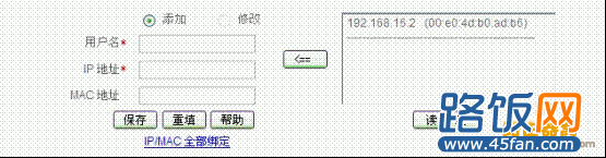 一、 首先在“高级配置”—“IP/MAC绑定”页面,将需要禁止上网的指定的PC做IP/MAC绑定,以固定电脑IP。