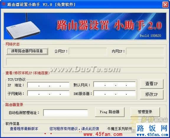 在日常电脑维护工作中,经常需要对路由器进行设置,虽然不是什么难事,但反复查看IP地址及登录查看,非常繁琐。为了简化操作,专门写了这么个小程序,一 可以显示本机的IP,初步判断IP是否正确?二可以Ping路由器试一下网线连接情况,三可以快速打开路由器登录界面,不用输入IP了,四是设置完毕后可 以Ping下外网测试是否已经连接到互联网。所有这些操作,只用鼠标点点就可以实现了,不用再用键盘输入来输入去的了,节省时间,同时,也利于电话指导不 会的人调试路由器。