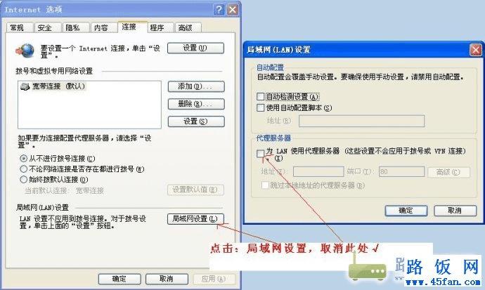 打开IE浏览器---工具--internet选项--连接选项卡--选择默认的网络连接,点设置---去除“对此连接使用代理服务器”的勾选(点击局域网设置:取消为LAN适用代理服务器),然后点确定,重启IE浏览器就行了(最好能够重启电脑)。具体操作如下图所示: