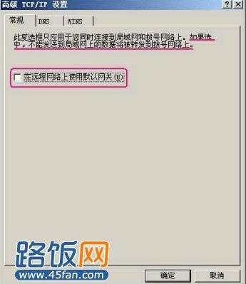2.取消勾选“在远程网络上使用默认网关”,打开TCP/IP属性对话框-高级选项,如下图所示: