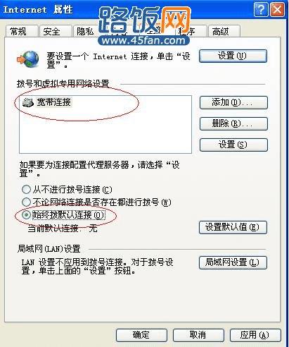 二、使用“宽带连接”自动拨号功能,设置方法:右击IE浏览器属性,进入Internet属性对话框,点击“连接”选项---选中“始终默认拨号连接”项,如下图所示: