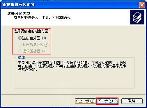 第四步:选择分区类型(主磁盘分区、扩展磁盘分区或逻辑驱动器),一般选择主磁盘分区即可,然后一直单击【下一步】,直到格式化完成。