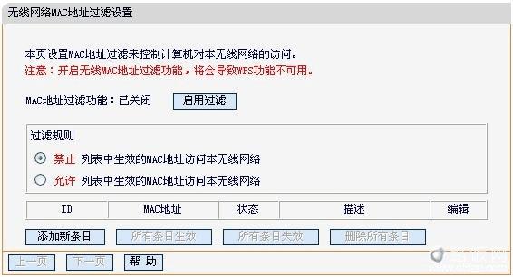 5、最安全的做法是,开启【MAC地址过滤】功能,把自己家用的电脑MAC地址加入白名单,其它的MAC都不允许连接。这种方法有些麻烦,每次朋友来家里玩,都需要手工把它的MAC加入到白名单。
