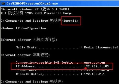 在带有打印机的电脑中, 开始--运行,在运行中输入“cmd回车”,敲击回车按键,然后在弹出界面内输入“ipconfig”,然后敲击回车按键,第一行就是这台电脑的IP地址。如下图: