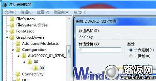 登录注册表编辑器,进入HKEY_LOCAL_MACHINE/SYSTEM/ControlSet001/Control/GraphicsDrivers/Configuration,依次展开下面的所有项目,双击右边窗口的“Scaling”名称,将数值数据由4改为3即可。