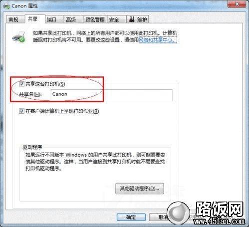切换到【共享】选项卡,勾选【共享这台打印机】,并且设置一个共享名(请记住该共享名,后面的设置可能会用到),如下图:
