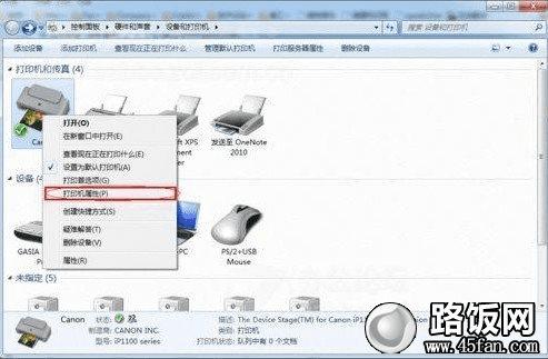在弹出的窗口中找到想共享的打印机(前提是打印机已正确连接,驱动已正确安装),在该打印机上右键,选择【打印机属性】,如下图: