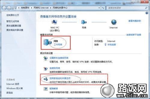 记住所处的网络类型,接着在弹出中窗口中单击【选择家庭组和共享选项】,如下图: