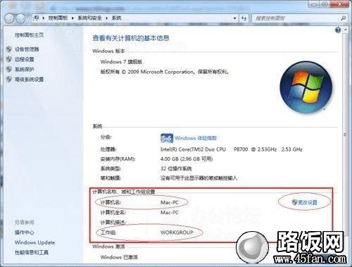 在弹出的窗口中找到工作组,如果计算机的工作组设置不一致,请点击【更改设置】;如果一致可以直接退出,跳到第五步。注意:请记住【计算机名】,后面的设置会用到。