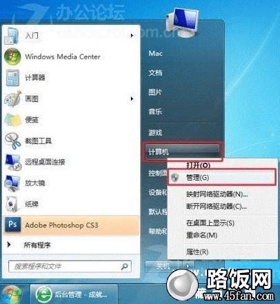 点击【开始】按钮,在【计算机】上右键,选择【管理】,如下图所示: