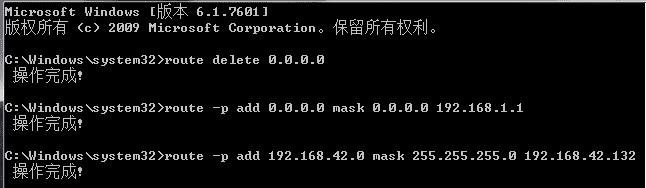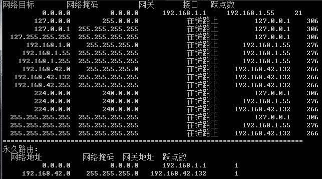 第三步: route -p add 192.168.42.0 mask 255.255.255.0 192.168.42.132 ::添加192.168.42.0网段路由为192.168.42.132内网路由,可以根据需要调整ip段和子网掩码太到多网段内网路由的效果。