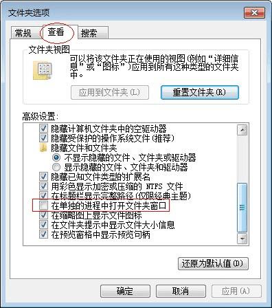 在文件夹选项中,切换到“查看”分页,找到下面的“在单独的进程中打开文件夹窗口”,把前面的钩去了。确定就可以了
