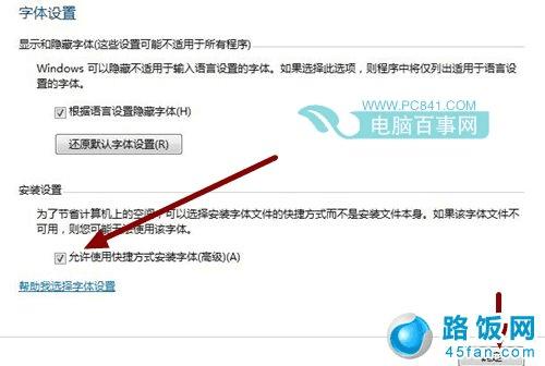 2、点击左侧的“字体设置”,打开字体设置窗口,在“安装设置”选项中勾选“允许使用快捷方式安装字体(高级)”选项,点击“确定”按钮 。