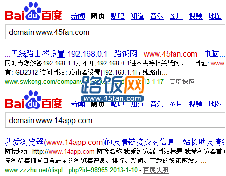 这几天,笔者没什么事研究起了网站的domain信息,搞过SEO的朋友都知道domain反链的意思,具体输入方法在百度搜索框中输入domain:域名(www.45fan.com),通过domain信息可以检测出当前网站是否是正常状态或是否被百度降权?笔者发现有意思的一点就是几乎所有有流量或有关键字排名的网站的domain信息都在首页第一位或前三位。