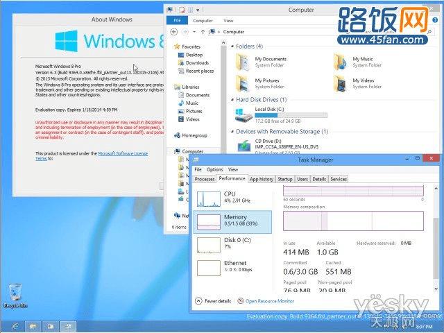 这个版本被认为是Windows Blue版本的首个里程碑,泄露的Windows Blue build 9364安装文件是32位操作系统版本,ISO文件的大小为2.63G,文件名为9364.0.FBL_PARTNER_OUT13.1303152105_X86FRE_CLIENT。