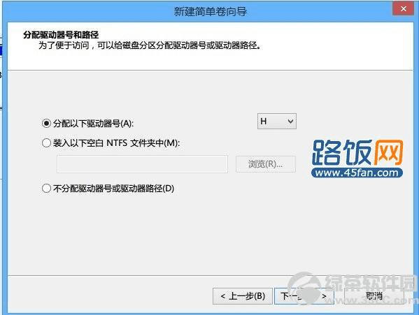5、在新建简单卷里分配所需盘符。如分配H盘,则在右边的下拉框中选择H即可。