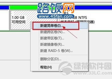 4、在新划分出来的空白空间选择邮件“新建简单卷”。