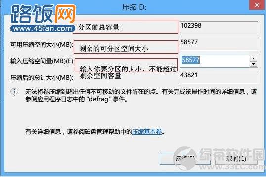 3、在压缩卷里填入需要分区的大小。很多朋友对空间容量的概念不是很清楚,下面笔者教大家怎么换算,我们常说的1G=1024M,100G=1024000M