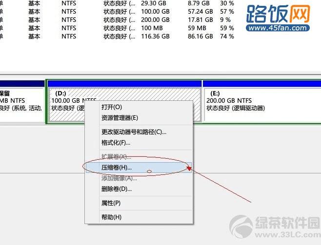 2、进入磁盘管理界面后,对所要分区的盘符右击》压缩卷。