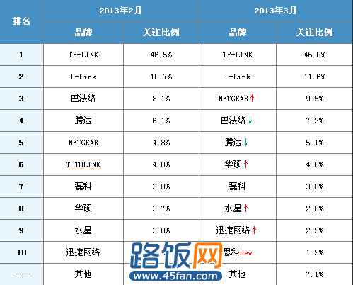 下面将列出2013年3月份同2月份各品牌无线路由器关注度的排名上升及下降度。