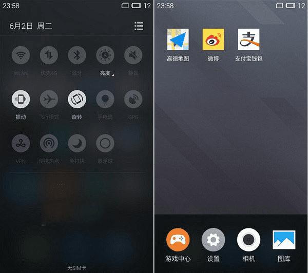 Flyme 4.5A通知栏与多任务窗口都采用了半透明毛玻璃的效果,非常美观。通知栏中也集合了大部分设置选项的快捷方式,方便用户在不进入设置菜单的情况下直接控制手机功能的开闭。由于是基于最新版Android打造,系统中的软件也加入了Material Design的一些元素。