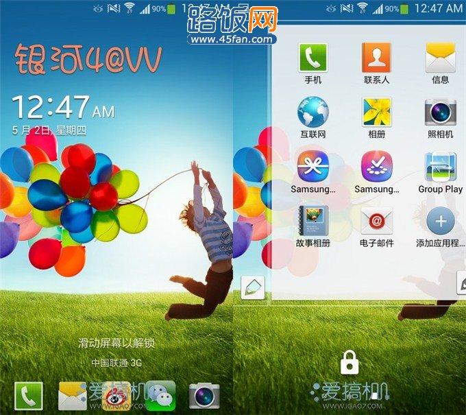 Galaxy S4使用的依然是三星手机管用的TouchWiz UI,不过这次的TouchWiz在很多细节上都有做改变和提升,首先最明细的当然是Galaxy S4使用了基于Android 4.2.2的系统,这也是除了“亲儿子”Nexus系列少有的官方升级到4.2.2的手机,以下是锁屏界面,可以看出相对于4.1的系统,Galaxy S4已经可以实现在锁屏的情况下通过左右滑动多屏切换▼