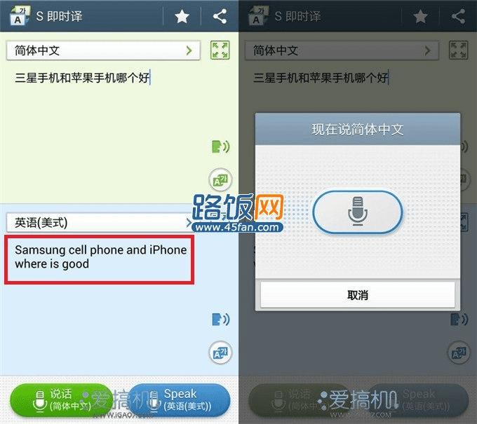 S即时翻译也是Galaxy S4发布会上的一个宣传重点,它可以让我们进行多国语言的互译、朗读。这里笔者也恶搞了一下这个功能,翻译的效果似乎不太好▼