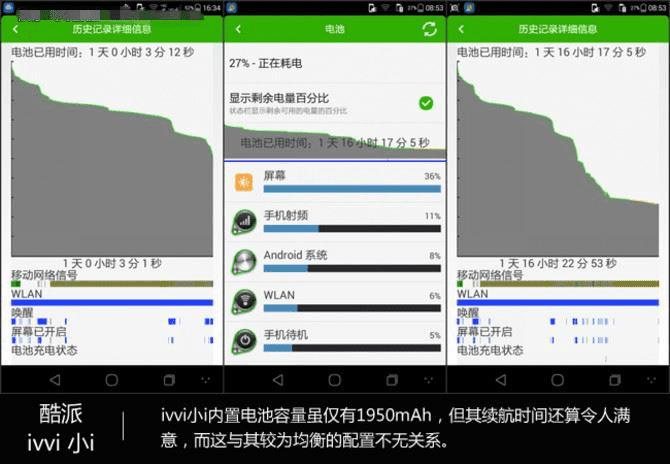 测试完ivvi小i的外观、系统以及拍照之后,用户心中只剩一个问题,该机的续航到底怎么样?超薄机身下1950mAh容量的电池究竟够不够用?关于这一点,笔者最初也有同样的疑问,但经过两天的使用之后,不能说完全打消了心中的疑虑,但该机的续航确实没有我们想的那么糟。
